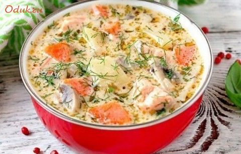 Аппетитный сырный суп с форелью и грибами